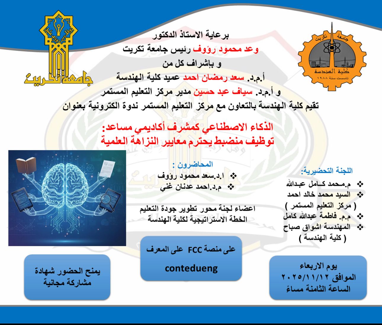 ضمن جهودها المتواصلة لمواكبة التطورات العلمية والتقنية الحديثة، تعلن كلية الهندسة في جامعة تكريت عن إقامة ندوة إلكترونية بعنوان: